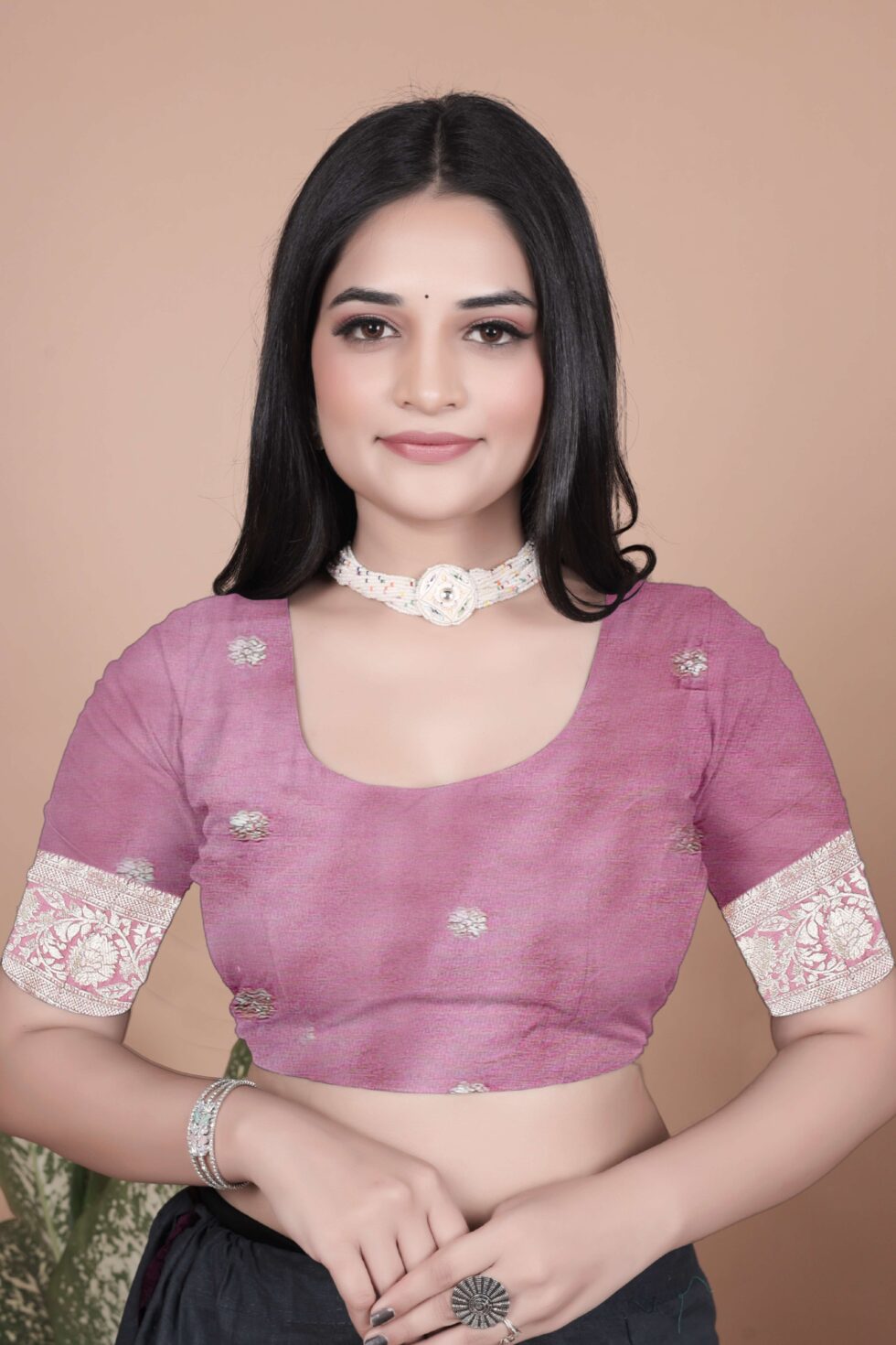 Step into regal elegance with this rosewood pink Banarasi silk saree, featuring golden zari floral motifs, ornate border, and a scenic peacock pallu. Perfect for weddings, festivals, and cultural events. Includes matching blouse piece.