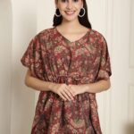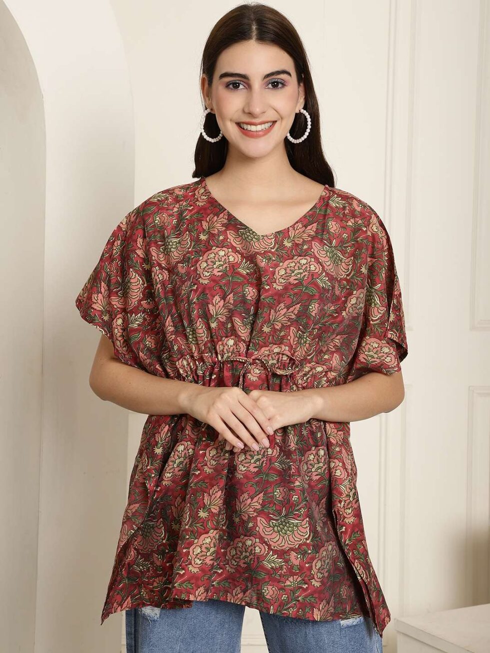 Women’s Chanderi Floral Printed Kaftan Top Dress in a rich maroon hue. Crafted from premium Chanderi fabric, this dress features a relaxed kaftan silhouette with elegant bell sleeves and delicate floral prints. Lightweight yet luxurious, it?s perfect for festive gatherings, casual occasions, or relaxed ethnic wear.