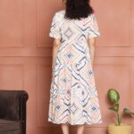 Women’s Cotton Printed A-Line Midi Dress | Short Sleeve Flared Gown Dress (White)
