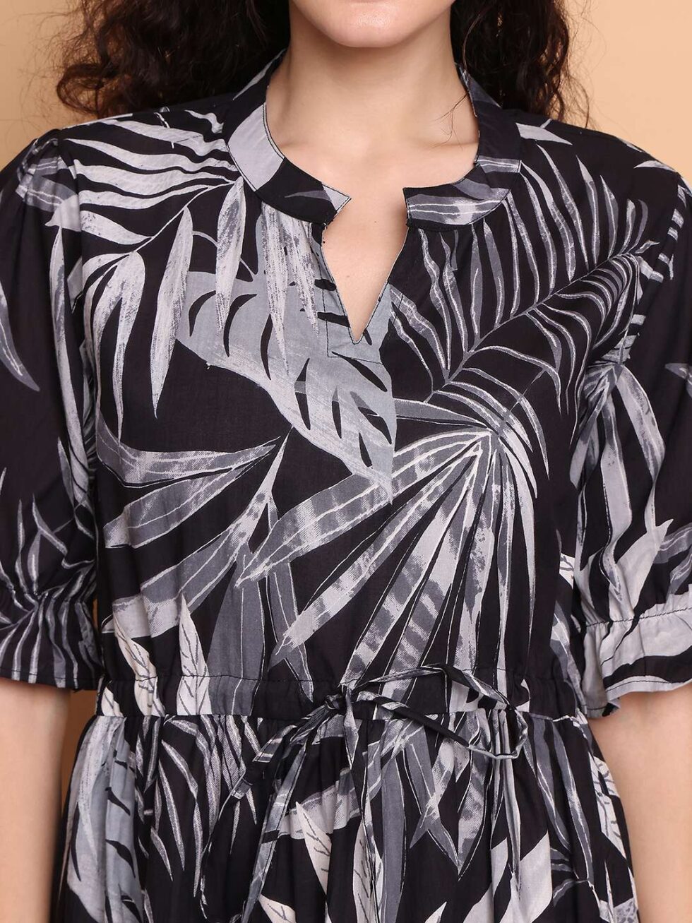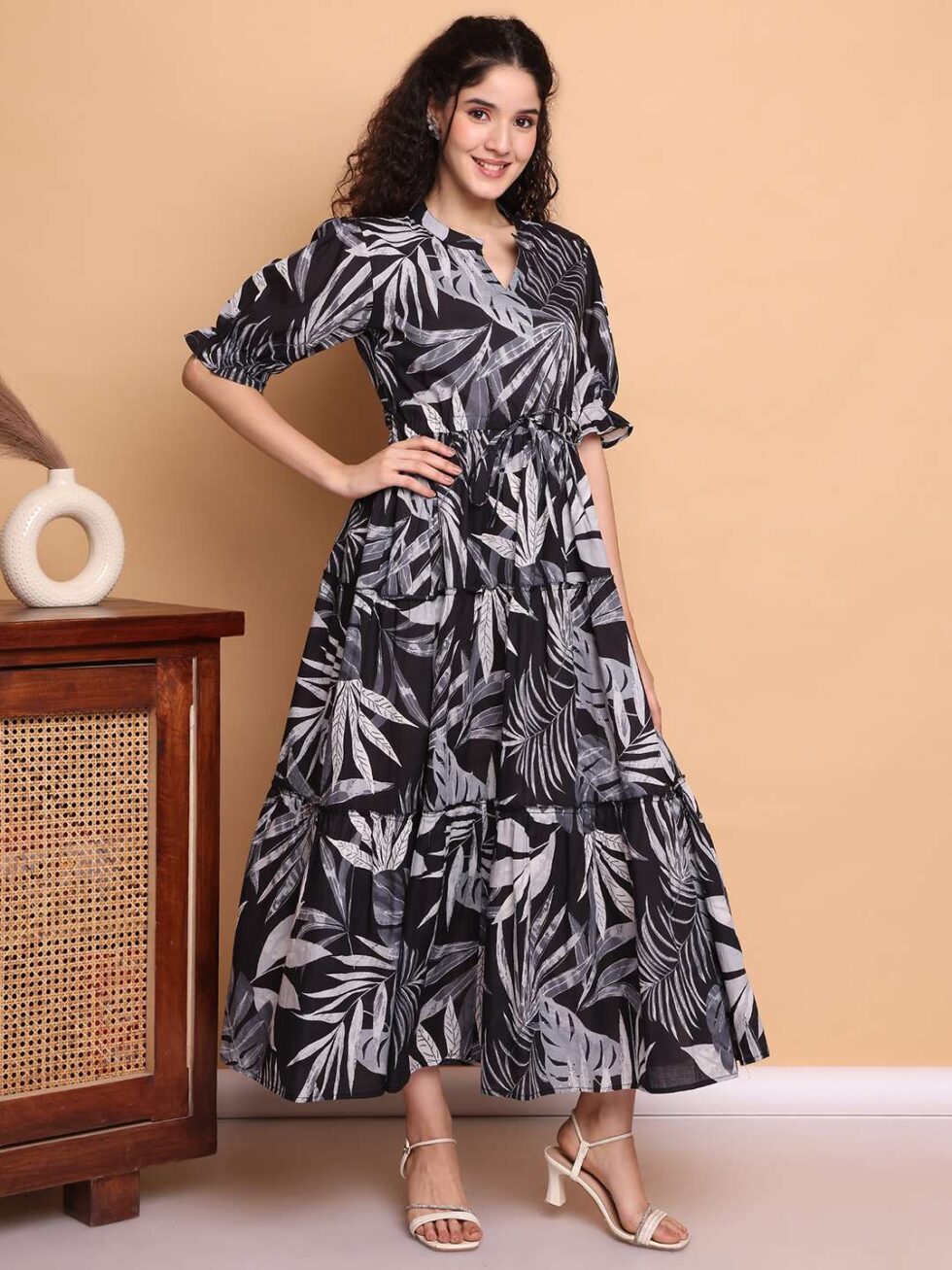 Women’s Cotton Printed Fit & Flare Anarkali Gown Midi Dress(Black Leaf)