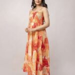 Women’s Silk Printed Shoulder Straps Sleeveless Anarkali Gown Drees (Orange Leaf)