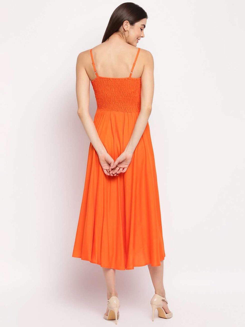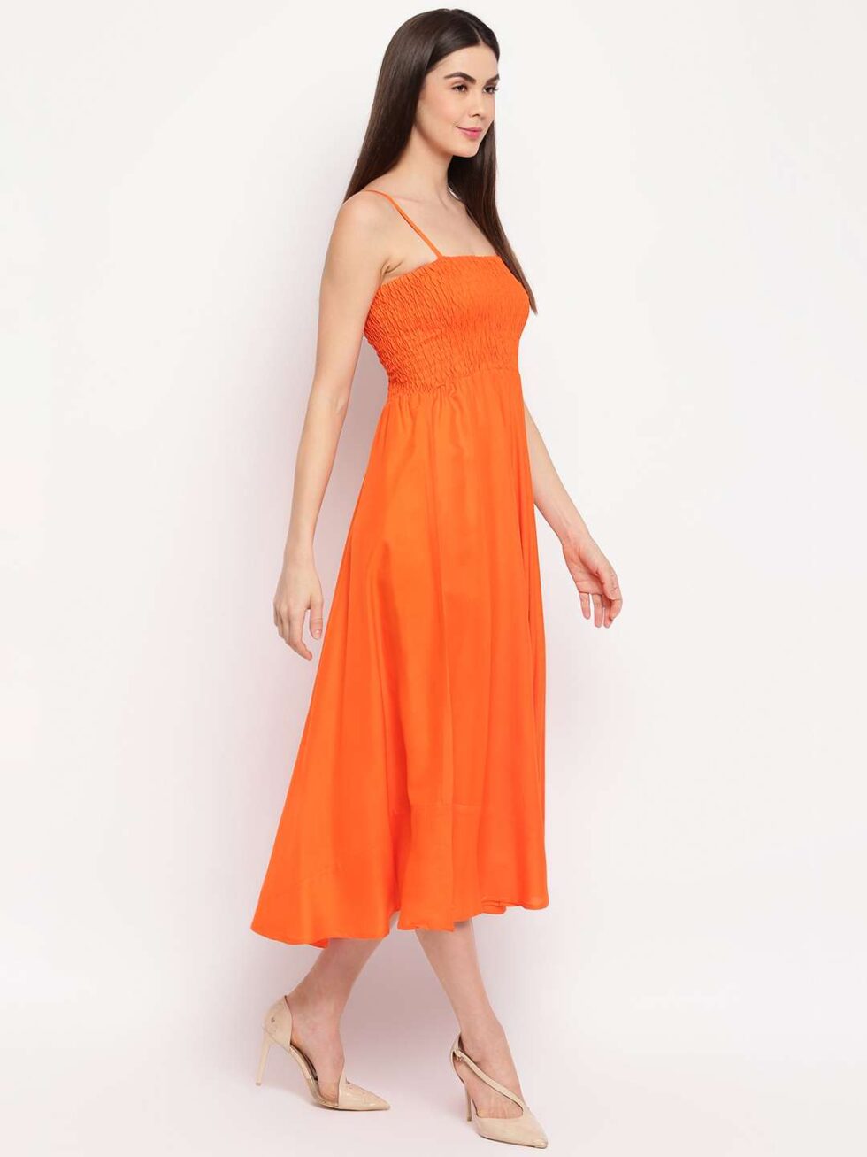 Women’s Viscose Rayon Solid Shoulder Straps Sleeveless Flared Gown Drees (Orange)